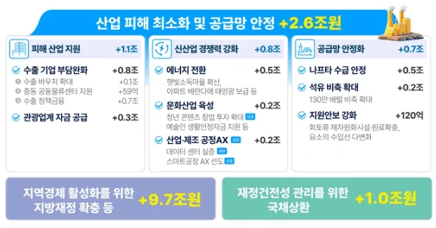 - 산업 피해 및 공급망 안정 (2.6조 원): 수출 기업 및 에너지 전환 지원