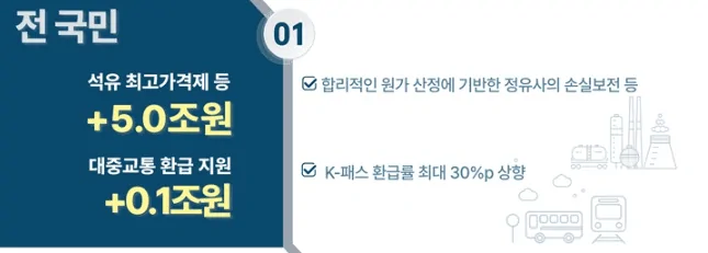 기름값뿐만 아니라 교통비 절감을 위해 K-패스 환급률을 한시적으로 최대 30%p 확대합니다. 또한 등유나 LPG를 사용하는 저소득층 20만 가구에는 에너지바우처 5만 원이 추가 지급됩니다. 이와 관련하여 K-패스 신청 및 환급액 계산기 활용법 포스팅도 참고하시면 큰 도움이 됩니다.