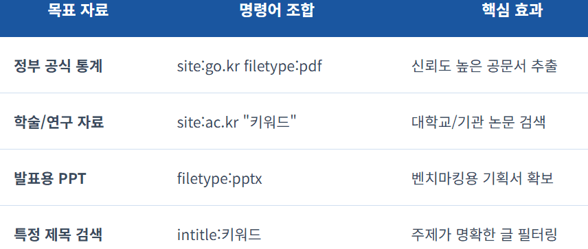 - filetype: (또는 ext:): pdf, pptx, xlsx 등 특정 파일 확장자만 찾아줍니다.