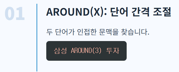 - AROUND(숫자): 두 단어가 설정한 숫자 이내의 간격으로 배치된 결과만 보여줍니다.