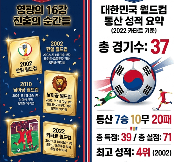 - 원정 16강 진출의 공통점: 2010년과 2022년 모두 마지막 경기까지 포기하지 않는 끈질긴 집중력이 돋보였습니다. 특히 2022년 포르투갈전의 역전승은 데이터 분석을 넘어서는 투혼의 결과였습니다.