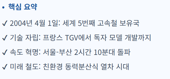 2004년 경부선과 호남선 1단계 개통을 시작으로, 현재는 강릉선, 중앙선, 중부내륙선 등 전국 구석구석을 잇는 촘촘한 망을 갖추게 되었습니다. 이제 대한민국은 고속철도 설계부터 운영까지 전 과정을 수출하는 철도 강국으로 우뚝 섰습니다.