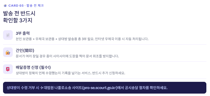 작성을 마쳤다면 발송 전 다음 3가지를 확인하세요. 이것만 지켜도 내용증명 효력을 200% 활용할 수 있습니다.