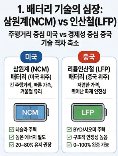 1. 배터리 기술의 심장: 삼원계(NCM) vs 인산철(LFP)