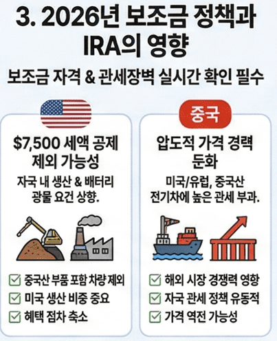 - 미국의 IRA 강화: 미국 정부는 자국 내 생산 비중과 배터리 광물 요건을 대폭 상향했습니다. 중국산 부품이 조금이라도 포함된 차량은 최대 $7,500의 세액 공제 대상에서 제외됩니다.
