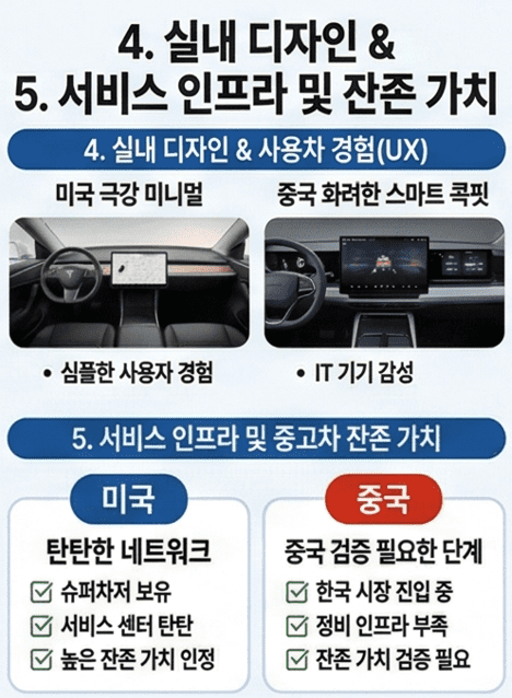 미국 브랜드인 테슬라는 이미 국내에 탄탄한 슈퍼차저 네트워크와 서비스 센터를 보유하고 있습니다. 또한 중고차 시장에서도 전기차 중 가장 높은 잔존 가치를 인정받습니다. 반면 중국 브랜드는 이제 막 한국 시장에 진입하는 단계로, 정비 인프라와 중고차 가격 방어 측면에서는 아직 검증이 필요한 상황입니다.